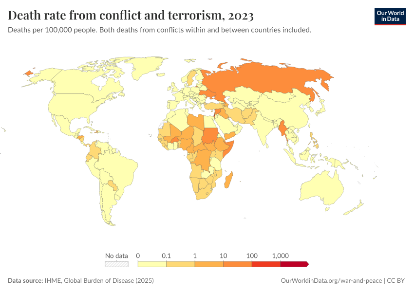 “Data Page: Death rate from conflict and terrorism”, part of the following publication: Esteban Ortiz-Ospina and Max Roser (2016) - “Global Health”. Data adapted from IHME, Global Burden of Disease. Retrieved from https://data-childlabor-ilounicef.owid.pages.dev:8789/20260323-161325/grapher/deaths-conflict-terrorism-per-100000.html [online resource] (archived on March 23, 2026).How to cite this data