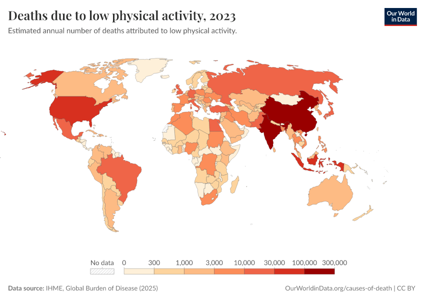 IHME, Global Burden of Disease (2025) – with major processing by Our World in Data. “Deaths due to low physical activity – IHME” [dataset]. IHME, Global Burden of Disease, “Global Burden of Disease - Risk Factors - Deaths” [original data]. Retrieved April 14, 2026 from https://data-childlabor-ilounicef.owid.pages.dev:8789/20260319-180137/grapher/deaths-due-to-low-physical-activity.html (archived on March 19, 2026).
