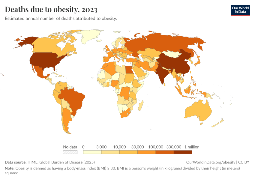 IHME, Global Burden of Disease (2025) – with major processing by Our World in Data. “Deaths due to obesity – IHME” [dataset]. IHME, Global Burden of Disease, “Global Burden of Disease - Risk Factors - Deaths” [original data]. Retrieved April 14, 2026 from https://data-childlabor-ilounicef.owid.pages.dev:8789/20260319-180137/grapher/deaths-due-to-obesity.html (archived on March 19, 2026).