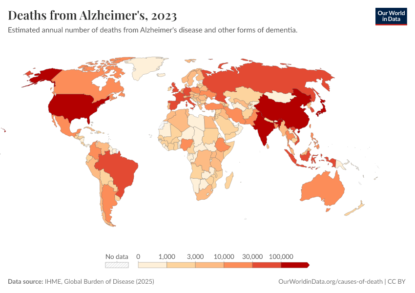 IHME, Global Burden of Disease (2025) – with major processing by Our World in Data. “Deaths from Alzheimer's – IHME” [dataset]. IHME, Global Burden of Disease, “Global Burden of Disease - Deaths” [original data]. Retrieved April 14, 2026 from https://data-childlabor-ilounicef.owid.pages.dev:8789/20260323-160356/grapher/deaths-from-alzheimers.html (archived on March 23, 2026).