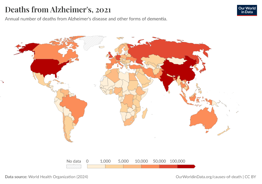 World Health Organization (2024) – with major processing by Our World in Data. “Deaths from Alzheimer's” [dataset]. World Health Organization, “Global Health Estimates” [original data]. Retrieved April 14, 2026 from https://data-childlabor-ilounicef.owid.pages.dev:8789/20260325-171315/grapher/deaths-from-alzheimers-other-dementias.html (archived on March 25, 2026).Download