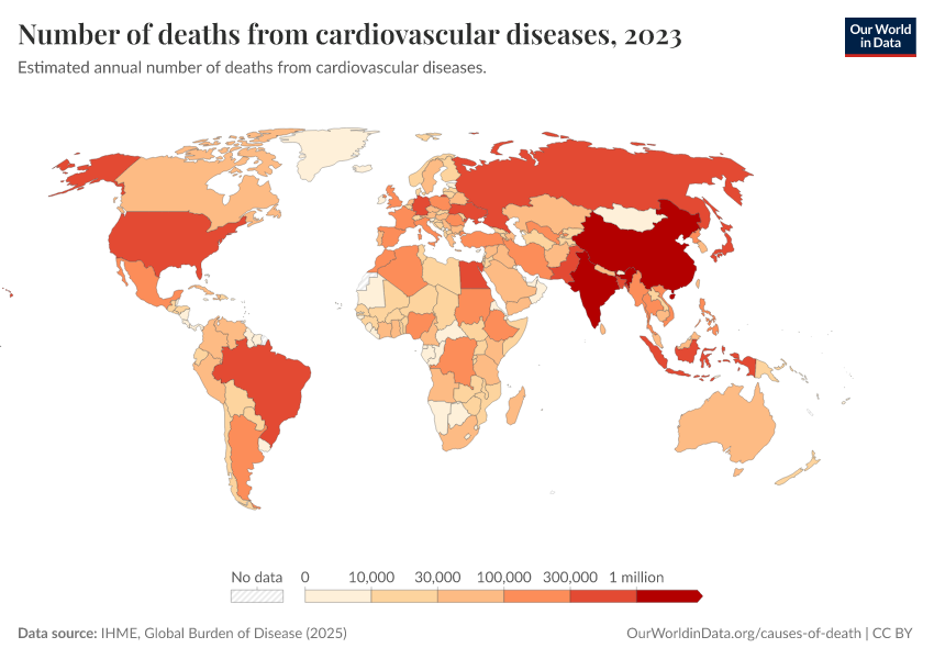 “Data Page: Number of deaths from cardiovascular diseases”, part of the following publication: Esteban Ortiz-Ospina and Max Roser (2016) - “Global Health”. Data adapted from IHME, Global Burden of Disease. Retrieved from https://data-childlabor-ilounicef.owid.pages.dev:8789/20260323-160356/grapher/deaths-from-cardiovascular-disease.html [online resource] (archived on March 23, 2026).How to cite this data