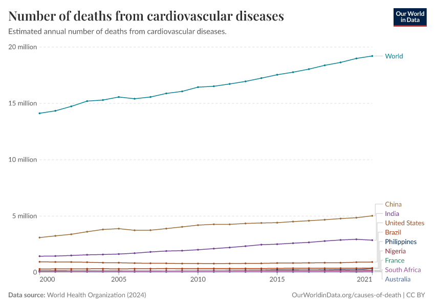 World Health Organization (2024) – with major processing by Our World in Data. “Number of deaths from cardiovascular diseases” [dataset]. World Health Organization, “Global Health Estimates” [original data]. Retrieved April 14, 2026 from https://data-childlabor-ilounicef.owid.pages.dev:8789/20260325-171315/grapher/deaths-from-cardiovascular-disease-ghe.html (archived on March 25, 2026).Download