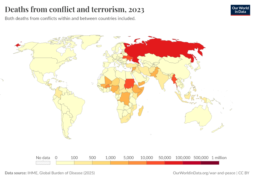IHME, Global Burden of Disease (2025) – with major processing by Our World in Data. “Deaths from conflict and terrorism – IHME” [dataset]. IHME, Global Burden of Disease, “Global Burden of Disease - Deaths” [original data]. Retrieved April 14, 2026 from https://data-childlabor-ilounicef.owid.pages.dev:8789/20260323-160356/grapher/deaths-from-conflict-and-terrorism.html (archived on March 23, 2026).