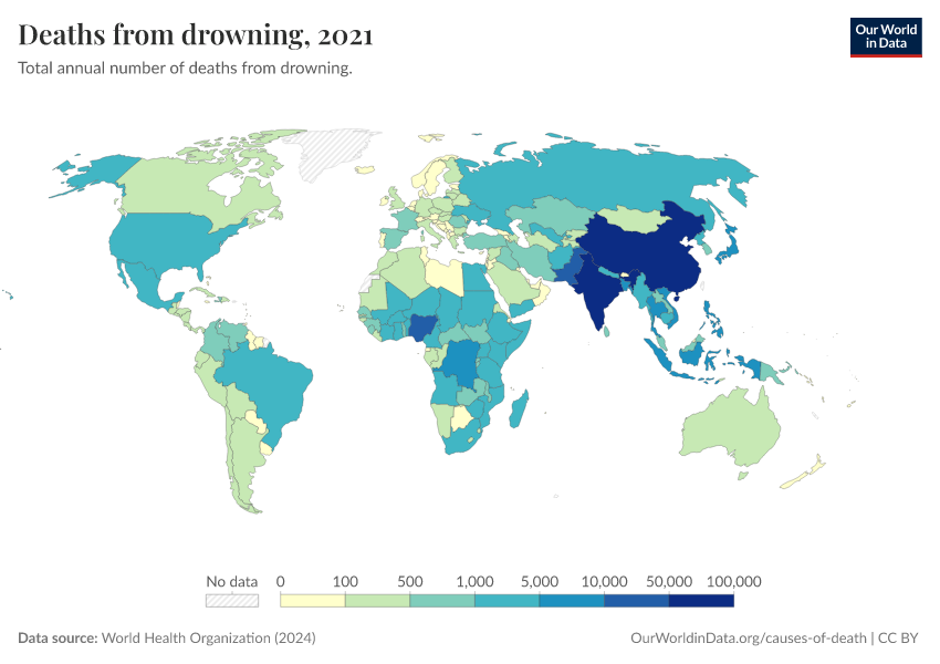 World Health Organization (2024) – with major processing by Our World in Data. “Deaths from drowning” [dataset]. World Health Organization, “Global Health Estimates” [original data]. Retrieved April 14, 2026 from https://data-childlabor-ilounicef.owid.pages.dev:8789/20260325-171315/grapher/deaths-from-drowning-ghe.html (archived on March 25, 2026).Download