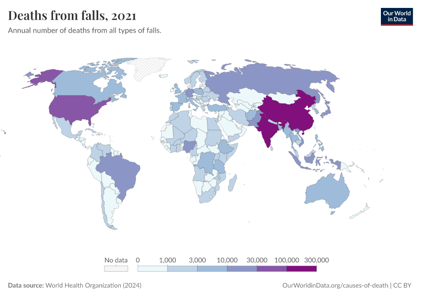 World Health Organization (2024) – with major processing by Our World in Data. “Deaths from falls” [dataset]. World Health Organization, “Global Health Estimates” [original data]. Retrieved April 14, 2026 from https://data-childlabor-ilounicef.owid.pages.dev:8789/20260325-171315/grapher/deaths-from-falls.html (archived on March 25, 2026).Download
