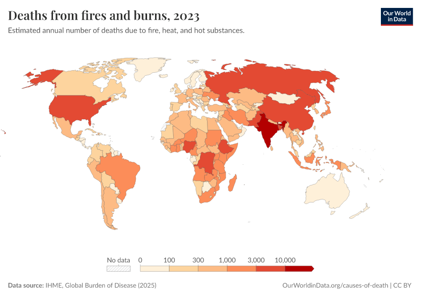 IHME, Global Burden of Disease (2025) – with major processing by Our World in Data. “Deaths from fires and burns – IHME” [dataset]. IHME, Global Burden of Disease, “Global Burden of Disease - Deaths” [original data]. Retrieved April 14, 2026 from https://data-childlabor-ilounicef.owid.pages.dev:8789/20260323-160356/grapher/deaths-from-fires-and-burns.html (archived on March 23, 2026).
