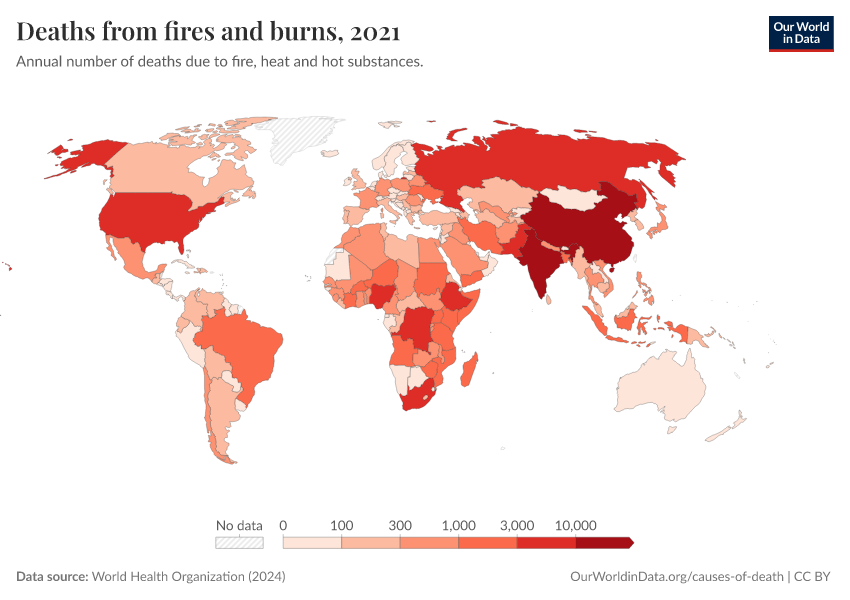 “Data Page: Deaths from fires and burns”, part of the following publication: Esteban Ortiz-Ospina and Max Roser (2016) - “Global Health”. Data adapted from World Health Organization. Retrieved from https://data-childlabor-ilounicef.owid.pages.dev:8789/20260325-171315/grapher/deaths-from-fires-and-burns-who.html [online resource] (archived on March 25, 2026).How to cite this data