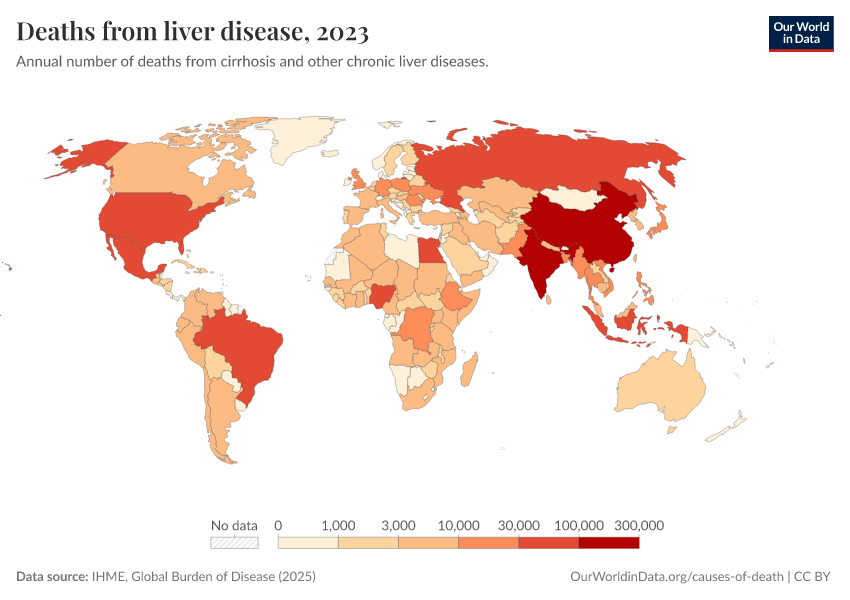 IHME, Global Burden of Disease (2025) – with major processing by Our World in Data. “Deaths from liver disease – IHME” [dataset]. IHME, Global Burden of Disease, “Global Burden of Disease - Deaths” [original data]. Retrieved April 14, 2026 from https://data-childlabor-ilounicef.owid.pages.dev:8789/20260323-160356/grapher/deaths-from-liver-disease.html (archived on March 23, 2026).
