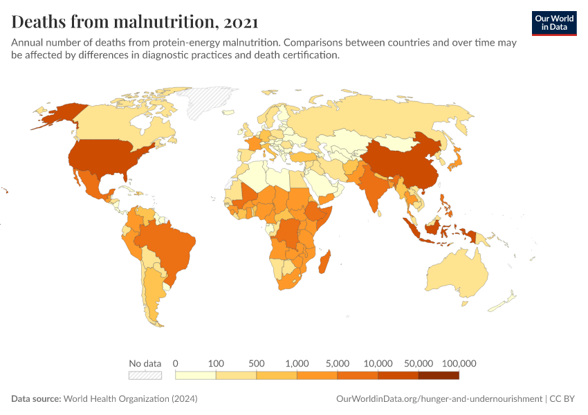 World Health Organization (2024) – with major processing by Our World in Data. “Deaths from malnutrition” [dataset]. World Health Organization, “Global Health Estimates” [original data]. Retrieved April 14, 2026 from https://data-childlabor-ilounicef.owid.pages.dev:8789/20260330-100833/grapher/deaths-from-malnutrition-ghe.html (archived on March 30, 2026).Download