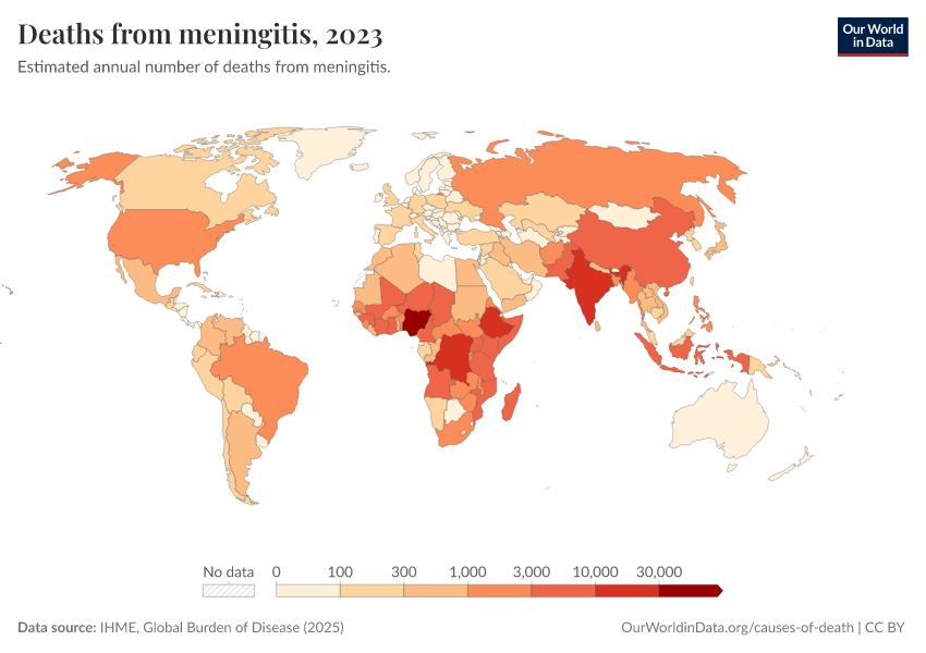“Data Page: Deaths from meningitis”, part of the following publication: Esteban Ortiz-Ospina and Max Roser (2016) - “Global Health”. Data adapted from IHME, Global Burden of Disease. Retrieved from https://data-childlabor-ilounicef.owid.pages.dev:8789/20260323-160356/grapher/deaths-from-meningitis.html [online resource] (archived on March 23, 2026).How to cite this data