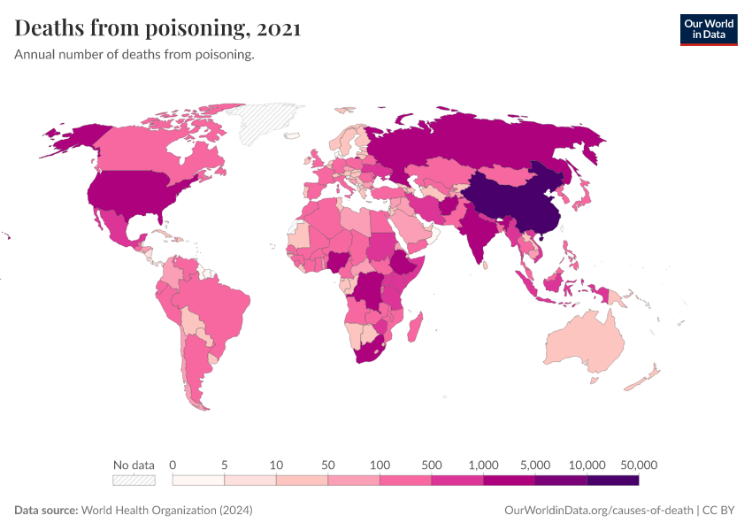 World Health Organization (2024) – with major processing by Our World in Data. “Deaths from poisoning” [dataset]. World Health Organization, “Global Health Estimates” [original data]. Retrieved April 14, 2026 from https://data-childlabor-ilounicef.owid.pages.dev:8789/20260325-171315/grapher/deaths-from-poisonings-ghe.html (archived on March 25, 2026).Download