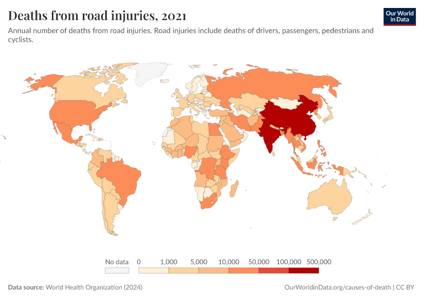 “Data Page: Deaths from road injuries”, part of the following publication: Esteban Ortiz-Ospina and Max Roser (2016) - “Global Health”. Data adapted from World Health Organization. Retrieved from https://data-childlabor-ilounicef.owid.pages.dev:8789/20260325-171315/grapher/deaths-from-road-injuries.html [online resource] (archived on March 25, 2026).How to cite this data