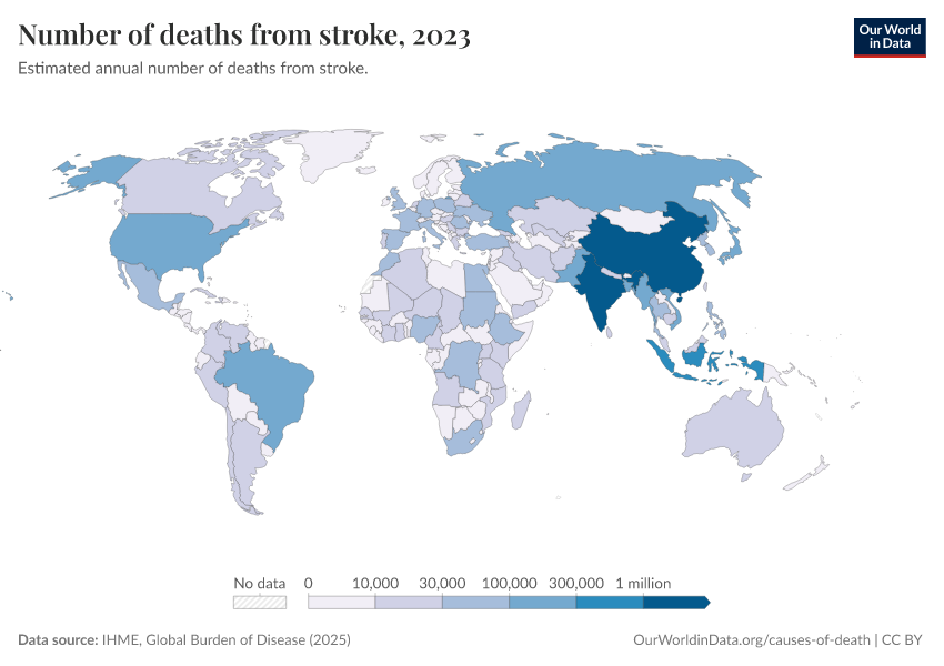 “Data Page: Number of deaths from stroke”, part of the following publication: Esteban Ortiz-Ospina and Max Roser (2016) - “Global Health”. Data adapted from IHME, Global Burden of Disease. Retrieved from https://data-childlabor-ilounicef.owid.pages.dev:8789/20260323-160356/grapher/deaths-from-strokes.html [online resource] (archived on March 23, 2026).How to cite this data