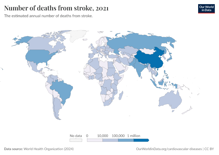 World Health Organization (2024) – with major processing by Our World in Data. “Number of deaths from stroke” [dataset]. World Health Organization, “Global Health Estimates” [original data]. Retrieved April 14, 2026 from https://data-childlabor-ilounicef.owid.pages.dev:8789/20260325-171315/grapher/deaths-from-strokes-ghe.html (archived on March 25, 2026).Download