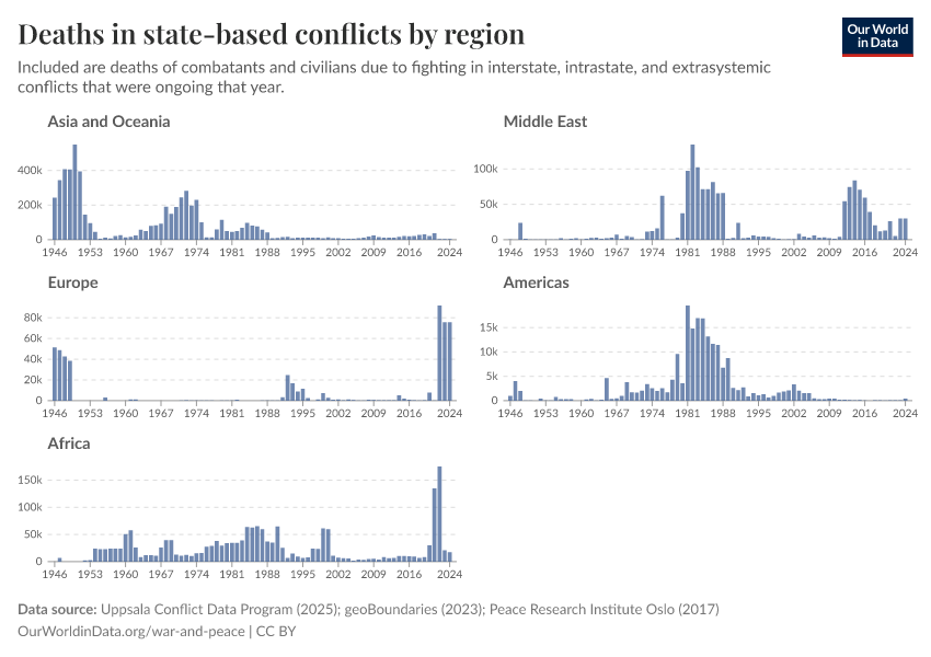 “Data Page: Deaths in state-based conflicts by region”, part of the following publication: Bastian Herre, Lucas Rodés-Guirao, and Max Roser (2024) - “War and Peace”. Data adapted from Uppsala Conflict Data Program, geoBoundaries, Peace Research Institute Oslo. Retrieved from https://data-childlabor-ilounicef.owid.pages.dev:8789/20260304-094028/grapher/deaths-in-state-based-conflicts-by-region.html [online resource] (archived on March 4, 2026).How to cite this data