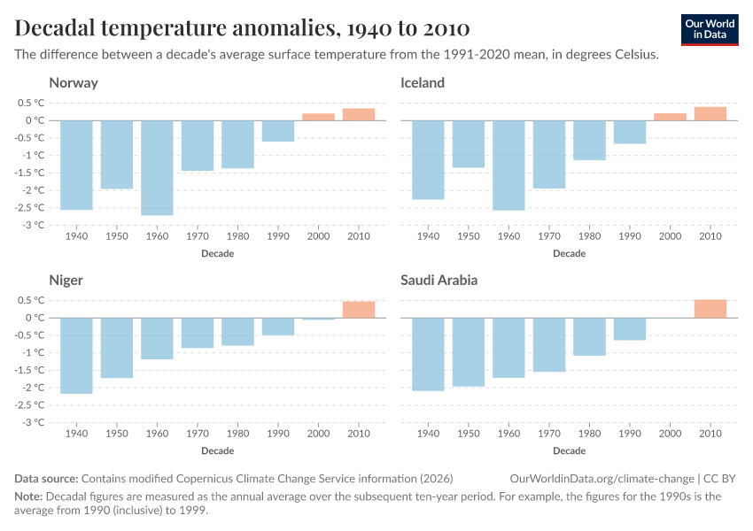 “Data Page: Decadal temperature anomalies”, part of the following publication: Hannah Ritchie, Pablo Rosado, and Veronika Samborska (2024) - “Climate Change”. Data adapted from Contains modified Copernicus Climate Change Service information. Retrieved from https://data-childlabor-ilounicef.owid.pages.dev:8789/20260309-085120/grapher/decadal-temperature-anomaly.html [online resource] (archived on March 9, 2026).How to cite this data