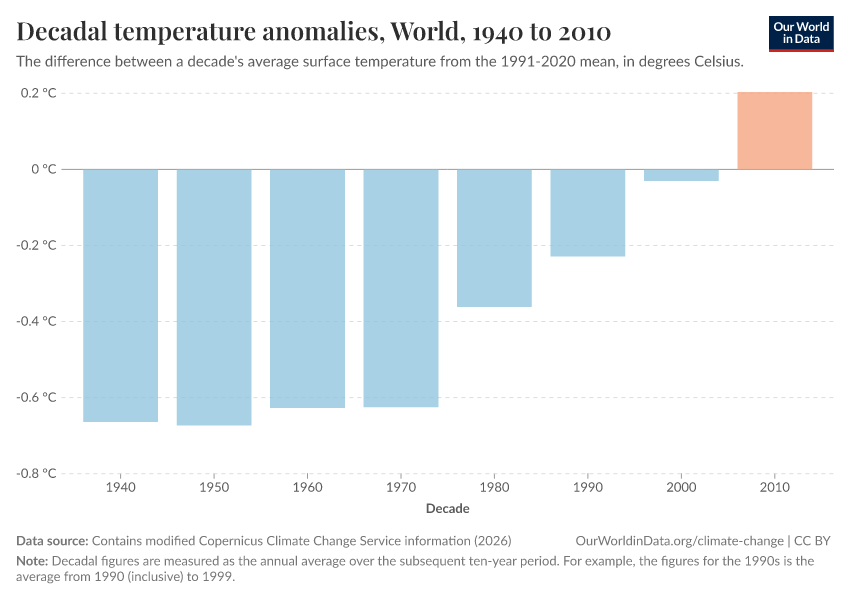 “Data Page: Decadal temperature anomalies”, part of the following publication: Hannah Ritchie, Pablo Rosado, and Veronika Samborska (2024) - “Climate Change”. Data adapted from Contains modified Copernicus Climate Change Service information. Retrieved from https://data-childlabor-ilounicef.owid.pages.dev:8789/20260309-085120/grapher/decadal-temperature-anomaly.html [online resource] (archived on March 9, 2026).