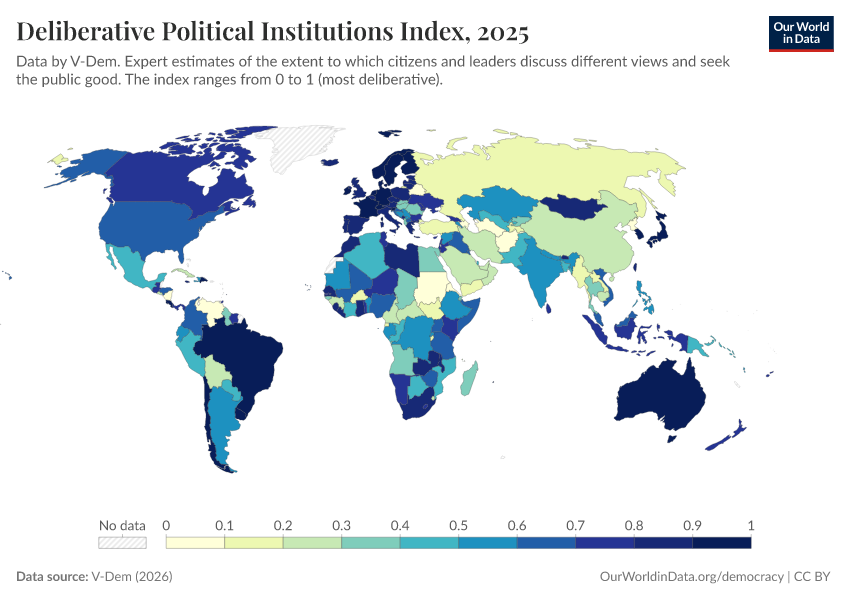 “Data Page: Deliberative political institutions index”, part of the following publication: Bastian Herre, Lucas Rodés-Guirao, and Esteban Ortiz-Ospina (2013) - “Democracy”. Data adapted from V-Dem. Retrieved from https://data-childlabor-ilounicef.owid.pages.dev:8789/20260402-164039/grapher/deliberative-political-institutions-index.html [online resource] (archived on April 2, 2026).How to cite this data
