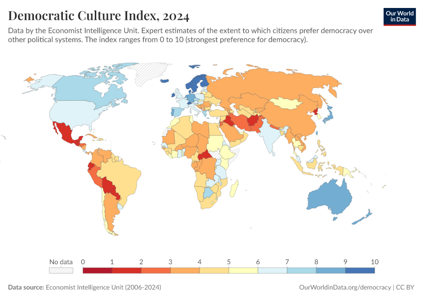 Economist Intelligence Unit (2006-2024) – processed by Our World in Data. “Democratic Culture Index” [dataset]. Economist Intelligence Unit, “Democracy Index 2021: The China challenge”; Economist Intelligence Unit, “Democracy Index 2022: Frontline democracy and the battle for Ukraine”; Economist Intelligence Unit, “Democracy Index 2023: Age of Conflict”; Economist Intelligence Unit, “Democracy Index 2024: What's wrong with representative democracy?”; Gapminder, “Democracy Index v4”; Various sources, “Population” [original data]. Retrieved April 14, 2026 from https://data-childlabor-ilounicef.owid.pages.dev:8789/20260402-164039/grapher/democratic-culture-index-eiu.html (archived on April 2, 2026).Download