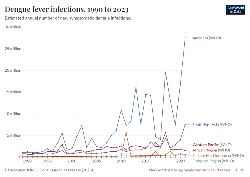 IHME, Global Burden of Disease (2025) – with major processing by Our World in Data. “Dengue fever infections – IHME” [dataset]. IHME, Global Burden of Disease, “Global Burden of Disease - Prevalence and Incidence” [original data]. Retrieved April 14, 2026 from https://data-childlabor-ilounicef.owid.pages.dev:8789/20260319-181852/grapher/dengue-incidence.html (archived on March 19, 2026).