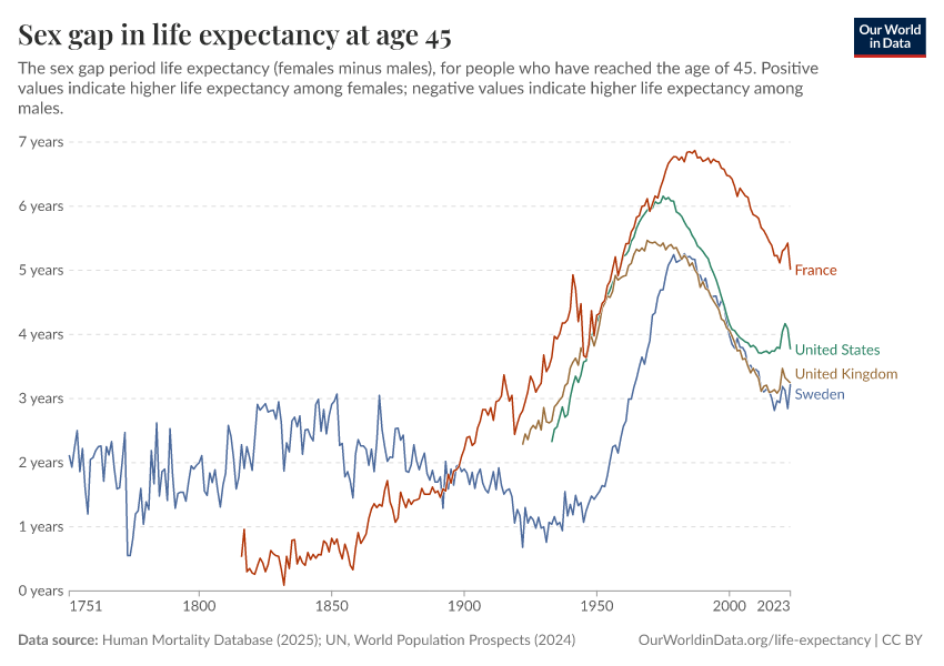 “Data Page: Life expectancy at 45”, part of the following publication: Saloni Dattani, Lucas Rodés-Guirao, Hannah Ritchie, Esteban Ortiz-Ospina, and Max Roser (2023) - “Life Expectancy”. Data adapted from Human Mortality Database, United Nations. Retrieved from https://data-childlabor-ilounicef.owid.pages.dev:8789/20260304-094028/grapher/difference-in-female-and-male-life-expectancy-at-age-45.html [online resource] (archived on March 4, 2026).How to cite this data