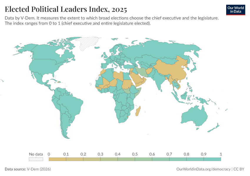 “Data Page: Elected officials index”, part of the following publication: Bastian Herre, Lucas Rodés-Guirao, and Esteban Ortiz-Ospina (2013) - “Democracy”. Data adapted from V-Dem. Retrieved from https://data-childlabor-ilounicef.owid.pages.dev:8789/20260402-164039/grapher/elected-political-leaders-index.html [online resource] (archived on April 2, 2026).How to cite this data