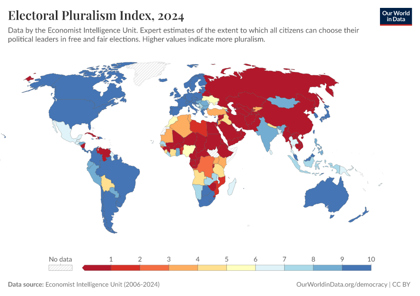 Economist Intelligence Unit (2006-2024) – processed by Our World in Data. “Electoral Pluralism Index” [dataset]. Economist Intelligence Unit, “Democracy Index 2021: The China challenge”; Economist Intelligence Unit, “Democracy Index 2022: Frontline democracy and the battle for Ukraine”; Economist Intelligence Unit, “Democracy Index 2023: Age of Conflict”; Economist Intelligence Unit, “Democracy Index 2024: What's wrong with representative democracy?”; Gapminder, “Democracy Index v4”; Various sources, “Population” [original data]. Retrieved April 14, 2026 from https://data-childlabor-ilounicef.owid.pages.dev:8789/20260402-164039/grapher/electoral-pluralism-index-eiu.html (archived on April 2, 2026).Download