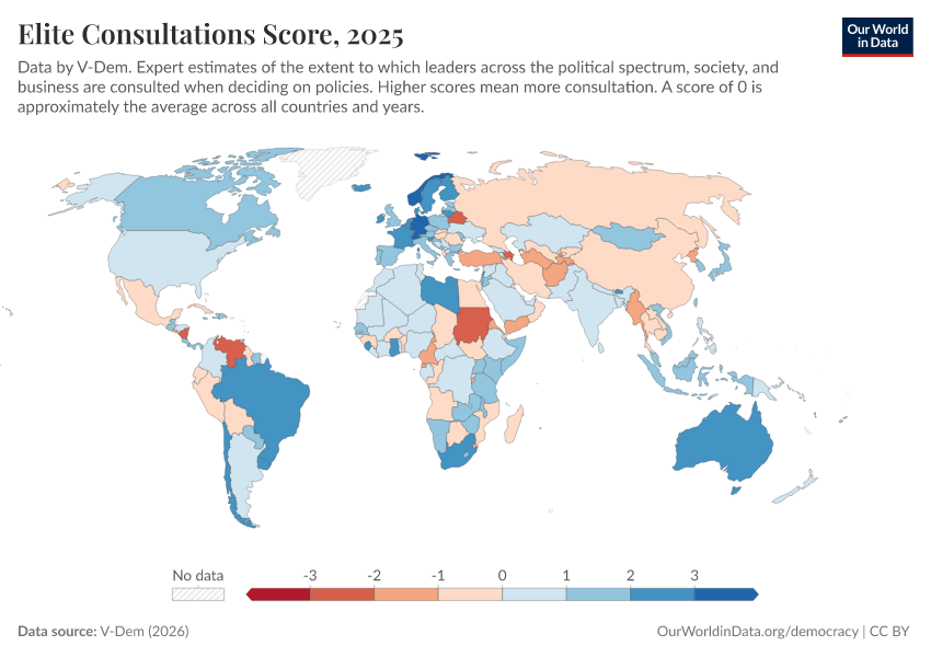 V-Dem (2026) – processed by Our World in Data. “Elite consultation – V-Dem” [dataset]. V-Dem, “Democracy report v16” [original data]. Retrieved April 14, 2026 from https://data-childlabor-ilounicef.owid.pages.dev:8789/20260402-164039/grapher/elite-consultations-score.html (archived on April 2, 2026).Download