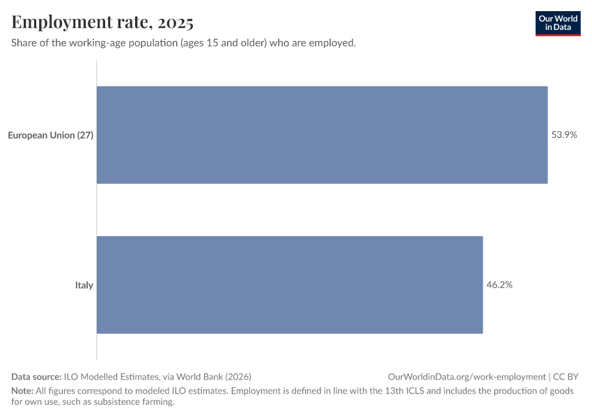 ILO Modelled Estimates, via World Bank (2026) – processed by Our World in Data. “Employment rate – ILO” [dataset]. ILO Modelled Estimates, via World Bank, “World Development Indicators 125” [original data]. Retrieved April 14, 2026 from https://data-childlabor-ilounicef.owid.pages.dev:8789/20260304-094028/grapher/employment-to-population-ratio.html (archived on March 4, 2026).