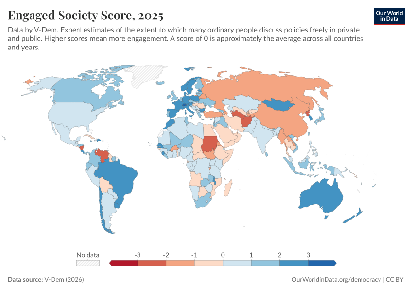 “Data Page: Engaged society”, part of the following publication: Bastian Herre, Lucas Rodés-Guirao, and Esteban Ortiz-Ospina (2013) - “Democracy”. Data adapted from V-Dem. Retrieved from https://data-childlabor-ilounicef.owid.pages.dev:8789/20260402-164039/grapher/engaged-society-score.html [online resource] (archived on April 2, 2026).How to cite this data