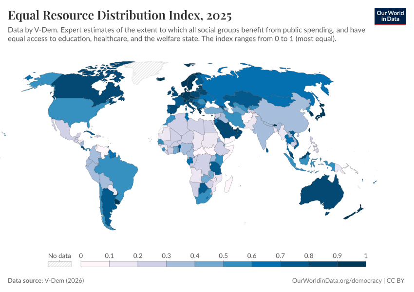 V-Dem (2026) – processed by Our World in Data. “Equal resource distribution index – V-Dem” [dataset]. V-Dem, “Democracy report v16” [original data]. Retrieved April 14, 2026 from https://data-childlabor-ilounicef.owid.pages.dev:8789/20260402-164039/grapher/equal-resource-distribution-index.html (archived on April 2, 2026).Download