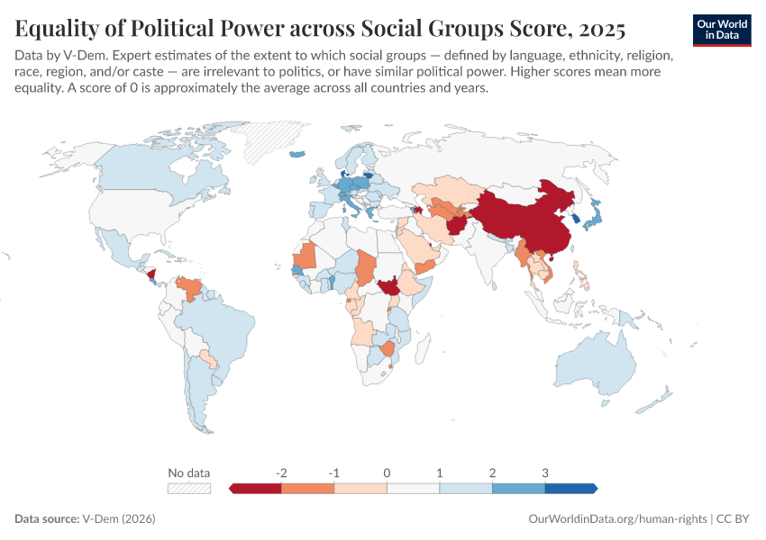V-Dem (2026) – processed by Our World in Data. “Equality of political power across social groups – V-Dem” [dataset]. V-Dem, “Democracy report v16” [original data]. Retrieved April 14, 2026 from https://data-childlabor-ilounicef.owid.pages.dev:8789/20260402-164039/grapher/equality-of-political-power-across-social-groups-score.html (archived on April 2, 2026).Download