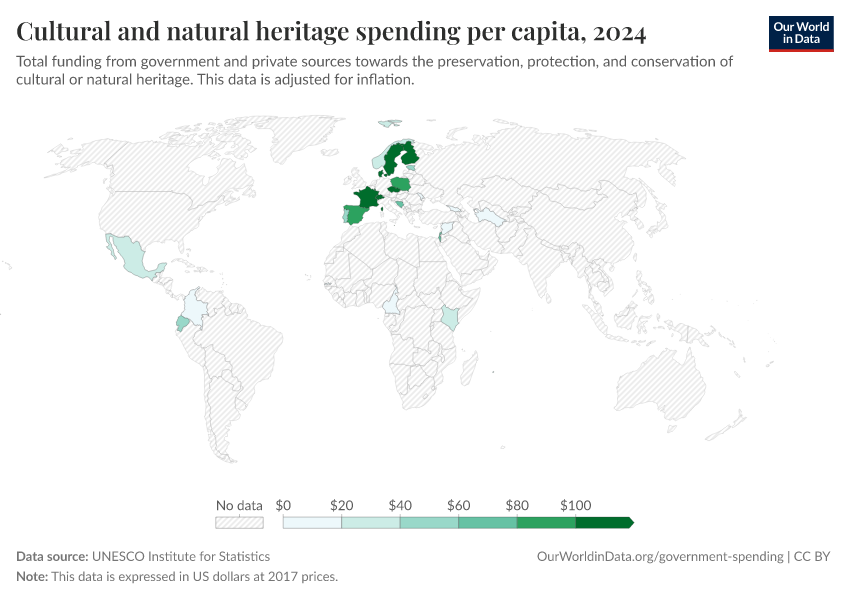 “Data Page: Cultural and natural heritage spending per capita”. Our World in Data (2026). Data adapted from UNESCO Institute for Statistics. Retrieved from https://data-childlabor-ilounicef.owid.pages.dev:8789/20260304-094028/grapher/expenditure-on-cultural-and-natural-heritage-per-capita.html [online resource] (archived on March 4, 2026).How to cite this data