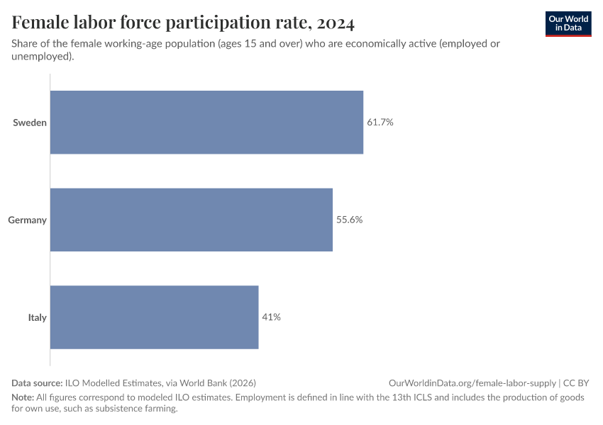 ILO Modelled Estimates, via World Bank (2026) – processed by Our World in Data. “Female labor force participation rate – ILO” [dataset]. ILO Modelled Estimates, via World Bank, “World Development Indicators 125” [original data]. Retrieved April 14, 2026 from https://data-childlabor-ilounicef.owid.pages.dev:8789/20260304-094028/grapher/female-labor-force-participation-rates.html (archived on March 4, 2026).