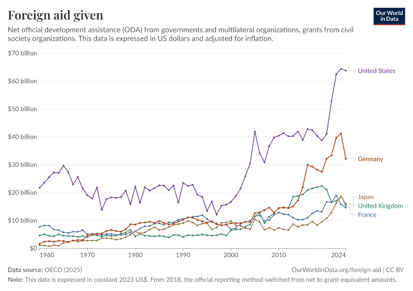 OECD (2025) – with major processing by Our World in Data. “Foreign aid given – Net disbursements” [dataset]. OECD, “OECD Official Development Assistance (ODA) - DAC1: Flows by provider (ODA+OOF+Private)”; OECD, “OECD Official Development Assistance (ODA) - DAC2A: Aid (ODA) disbursements to countries and regions” [original data]. Retrieved April 14, 2026 from https://data-childlabor-ilounicef.owid.pages.dev:8789/20260304-094028/grapher/foreign-aid-given-net.html (archived on March 4, 2026).Download