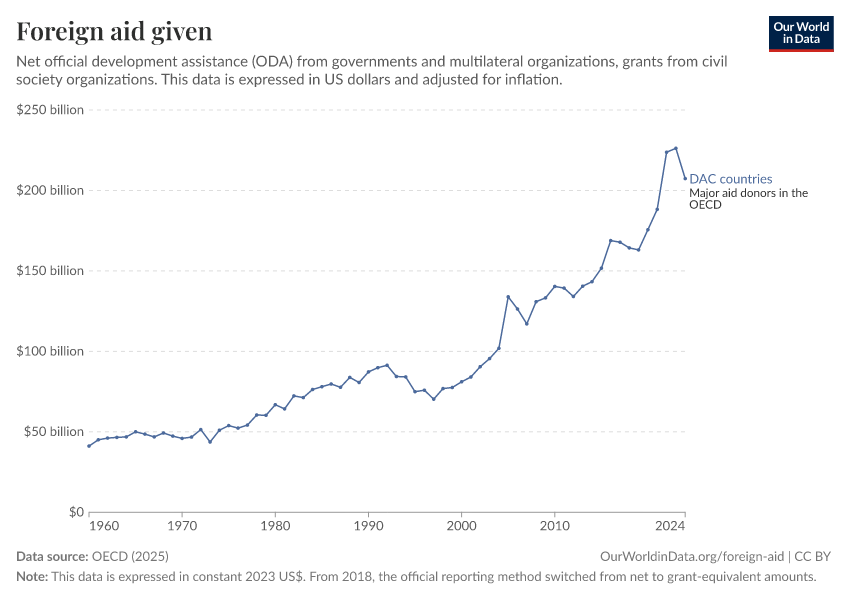 OECD (2025) – with major processing by Our World in Data. “Foreign aid given – Net disbursements” [dataset]. OECD, “OECD Official Development Assistance (ODA) - DAC1: Flows by provider (ODA+OOF+Private)”; OECD, “OECD Official Development Assistance (ODA) - DAC2A: Aid (ODA) disbursements to countries and regions” [original data]. Retrieved April 14, 2026 from https://data-childlabor-ilounicef.owid.pages.dev:8789/20260304-094028/grapher/foreign-aid-given-net.html (archived on March 4, 2026).Download