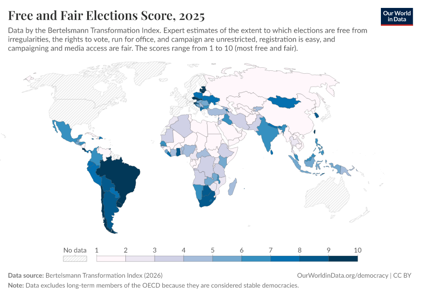 Bertelsmann Transformation Index (2026) – processed by Our World in Data. “Free and Fair Elections Score” [dataset]. Bertelsmann Transformation Index, “Bertelsmann Transformation Index, Scores” [original data]. Retrieved April 14, 2026 from https://data-childlabor-ilounicef.owid.pages.dev:8789/20260327-184752/grapher/free-fair-elections-bti.html (archived on March 27, 2026).Download