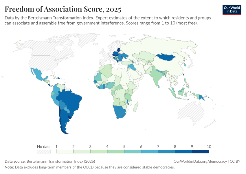 “Data Page: Freedom of Association Score”, part of the following publication: Bastian Herre, Lucas Rodés-Guirao, and Esteban Ortiz-Ospina (2013) - “Democracy”. Data adapted from Bertelsmann Transformation Index. Retrieved from https://data-childlabor-ilounicef.owid.pages.dev:8789/20260327-184752/grapher/freedom-of-association-score-bti.html [online resource] (archived on March 27, 2026).How to cite this data