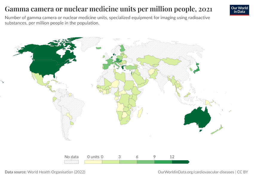 “Data Page: Gamma camera or nuclear medicine units per million people”, part of the following publication: Saloni Dattani, Veronika Samborska, Hannah Ritchie, and Max Roser (2023) - “Cardiovascular Diseases”. Data adapted from World Health Organisation. Retrieved from https://data-childlabor-ilounicef.owid.pages.dev:8789/20260304-094028/grapher/gamma-camera-or-nuclear-medicine-availability.html [online resource] (archived on March 4, 2026).How to cite this data
