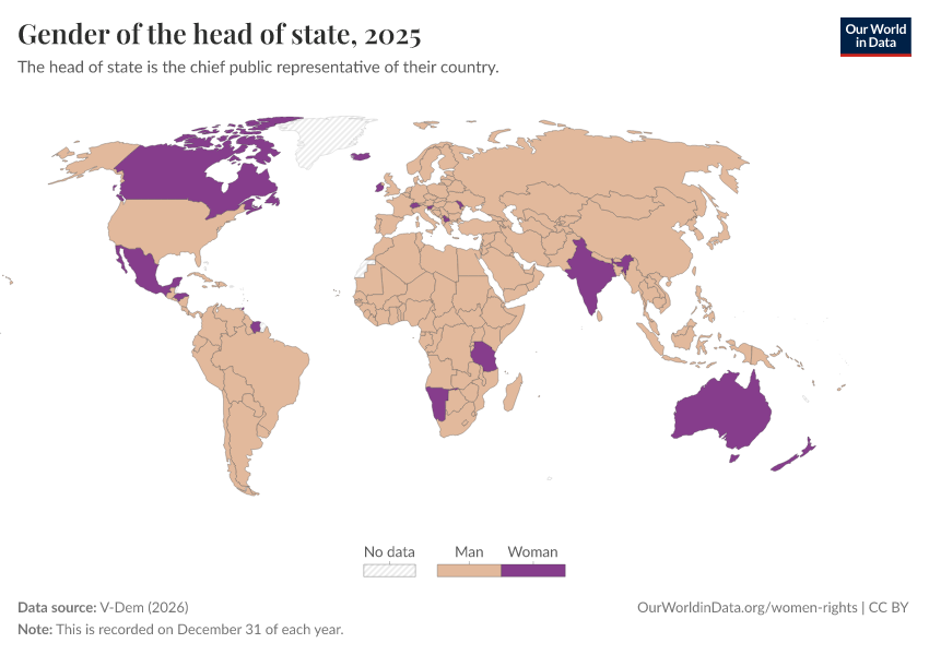 V-Dem (2026) – processed by Our World in Data. “Gender of the head of state” [dataset]. V-Dem, “Democracy report v16” [original data]. Retrieved April 14, 2026 from https://data-childlabor-ilounicef.owid.pages.dev:8789/20260318-112846/grapher/gender-of-the-head-of-state.html (archived on March 18, 2026).Download