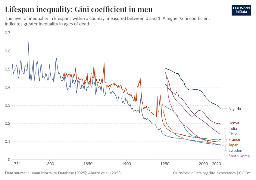 “Data Page: Lifespan inequality: Gini coefficient in men”, part of the following publication: Saloni Dattani, Lucas Rodés-Guirao, Hannah Ritchie, Esteban Ortiz-Ospina, and Max Roser (2023) - “Life Expectancy”. Data adapted from Human Mortality Database, United Nations. Retrieved from https://data-childlabor-ilounicef.owid.pages.dev:8789/20260304-094028/grapher/gini-coefficient-of-lifespan-inequality-in-males.html [online resource] (archived on March 4, 2026).How to cite this data