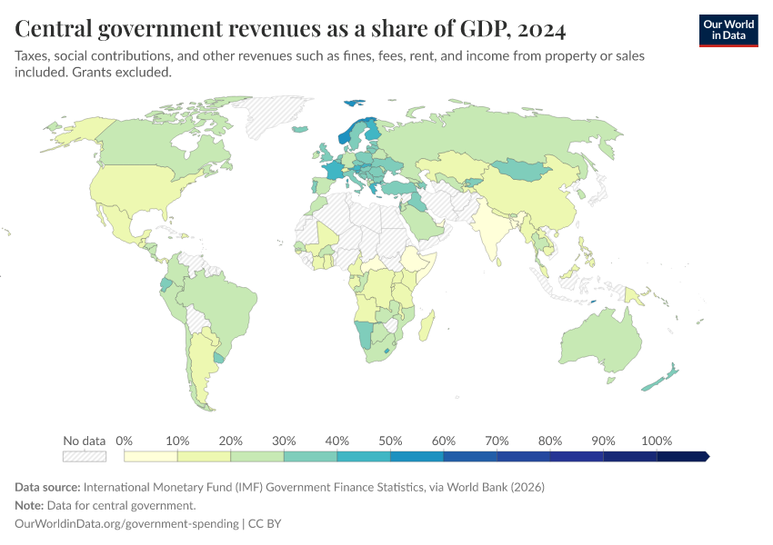 “Data Page: Central government revenues as a share of GDP”. Our World in Data (2026). Data adapted from International Monetary Fund (IMF) Government Finance Statistics, via World Bank. Retrieved from https://data-childlabor-ilounicef.owid.pages.dev:8789/20260304-094028/grapher/government-revenues-as-a-share-of-gdp-world-bank.html [online resource] (archived on March 4, 2026).How to cite this data