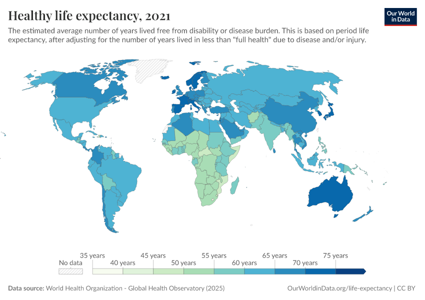 “Data Page: Healthy life expectancy”. Our World in Data (2026). Data adapted from World Health Organization. Retrieved from https://data-childlabor-ilounicef.owid.pages.dev:8789/20260304-094028/grapher/healthy-life-expectancy-at-birth.html [online resource] (archived on March 4, 2026).How to cite this data
