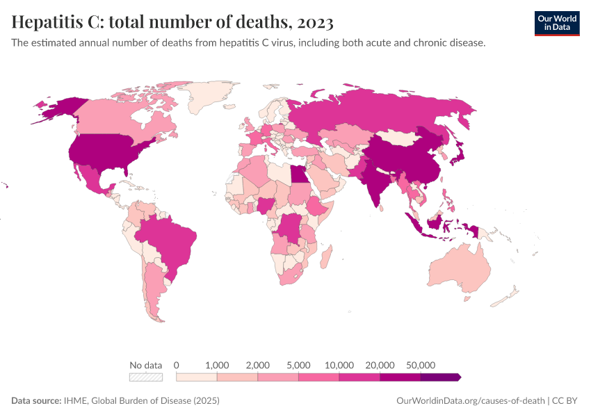 “Data Page: Hepatitis C: total number of deaths”, part of the following publication: Esteban Ortiz-Ospina and Max Roser (2016) - “Global Health”. Data adapted from IHME, Global Burden of Disease. Retrieved from https://data-childlabor-ilounicef.owid.pages.dev:8789/20260323-160356/grapher/hepatitis-c-number-of-deaths.html [online resource] (archived on March 23, 2026).How to cite this data
