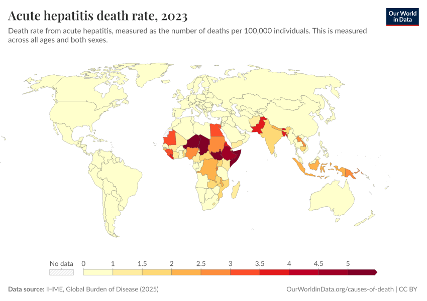 “Data Page: Acute hepatitis death rate”, part of the following publication: Esteban Ortiz-Ospina and Max Roser (2016) - “Global Health”. Data adapted from IHME, Global Burden of Disease. Retrieved from https://data-childlabor-ilounicef.owid.pages.dev:8789/20260323-161325/grapher/hepatitis-death-rate.html [online resource] (archived on March 23, 2026).How to cite this data