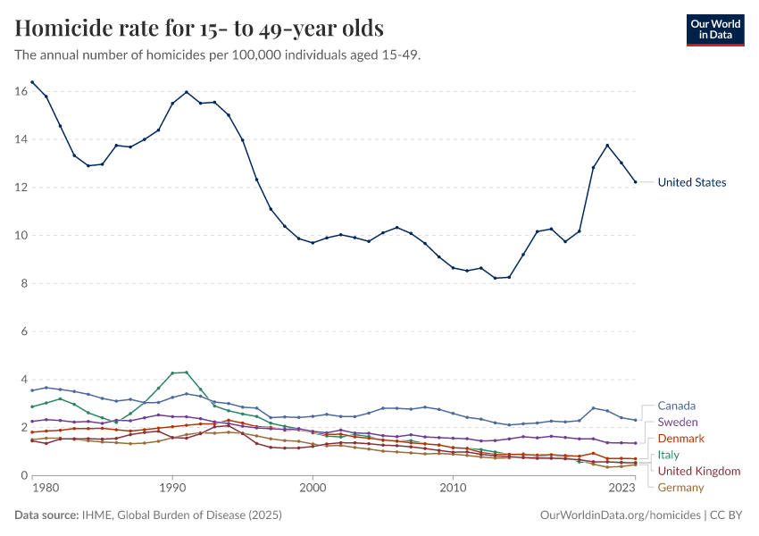 IHME, Global Burden of Disease (2025) – with major processing by Our World in Data. “Homicide rate for 15- to 49-year olds – IHME” [dataset]. IHME, Global Burden of Disease, “Global Burden of Disease - Deaths” [original data]. Retrieved April 14, 2026 from https://data-childlabor-ilounicef.owid.pages.dev:8789/20260323-161325/grapher/homicide-rate-in-15--to-49-year-olds.html (archived on March 23, 2026).
