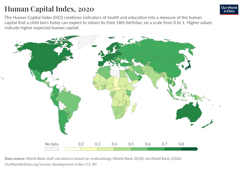 “Data Page: Human Capital Index”. Our World in Data (2026). Data adapted from World Bank staff calculations based on methodology (World Bank 2018), via World Bank. Retrieved from https://data-childlabor-ilounicef.owid.pages.dev:8789/20260325-171315/grapher/human-capital-index-in-2018.html [online resource] (archived on March 25, 2026).How to cite this data
