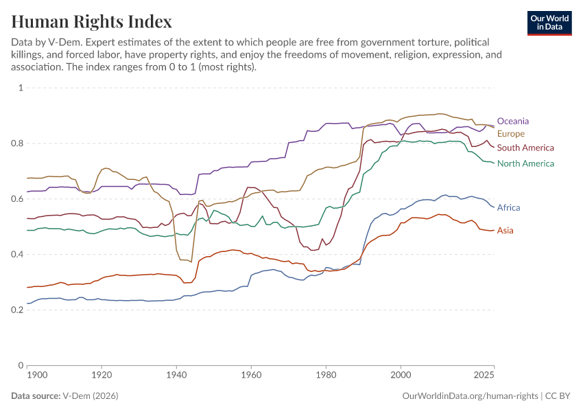 V-Dem (2026) – processed by Our World in Data. “Human rights index – V-Dem” [dataset]. V-Dem, “Democracy report v16” [original data]. Retrieved April 14, 2026 from https://data-childlabor-ilounicef.owid.pages.dev:8789/20260402-164039/grapher/human-rights-index-vdem.html (archived on April 2, 2026).Download