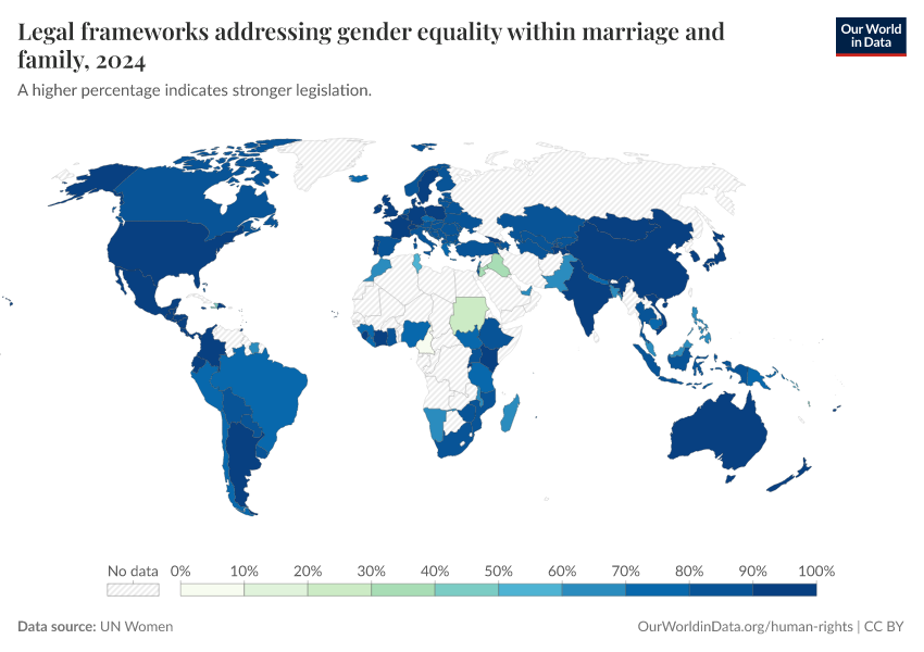 “Data Page: Legal frameworks addressing gender equality within marriage and family”. Our World in Data (2026). Data adapted from UN Women. Retrieved from https://data-childlabor-ilounicef.owid.pages.dev:8789/20260304-094028/grapher/legal-frameworks-gender-equality-within-marriage-and-family.html [online resource] (archived on March 4, 2026).How to cite this data